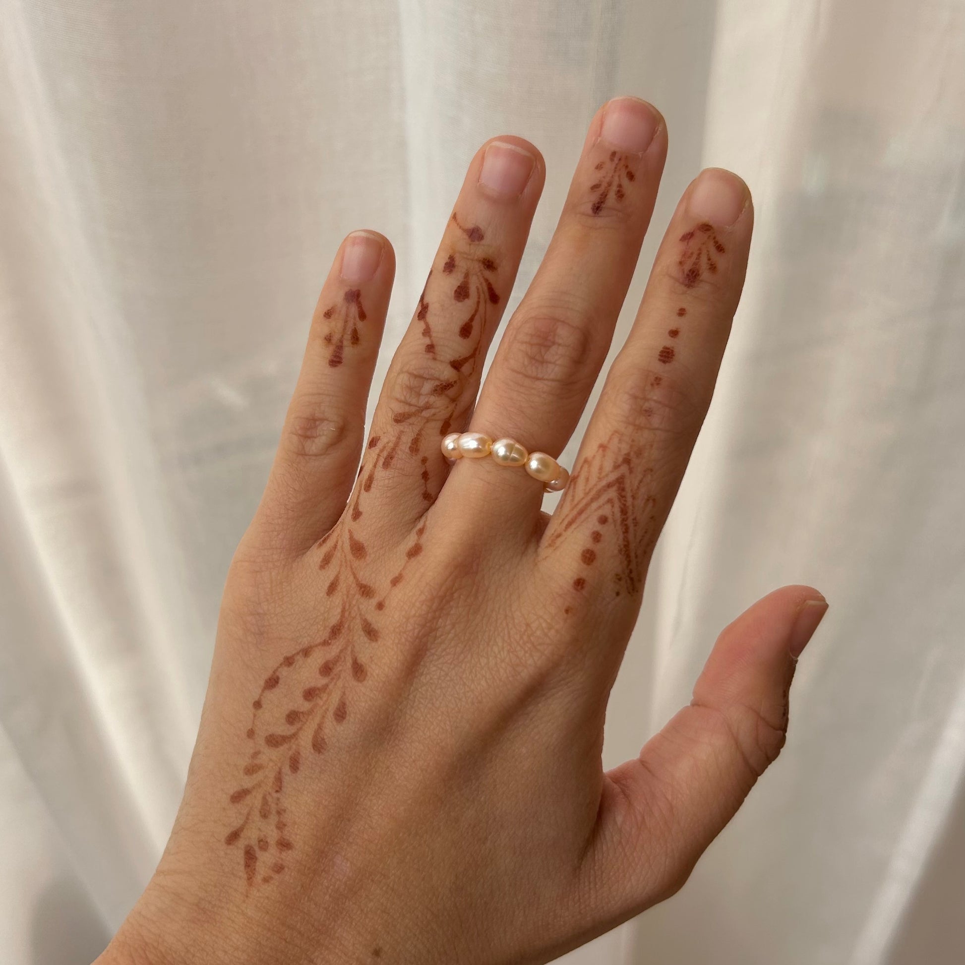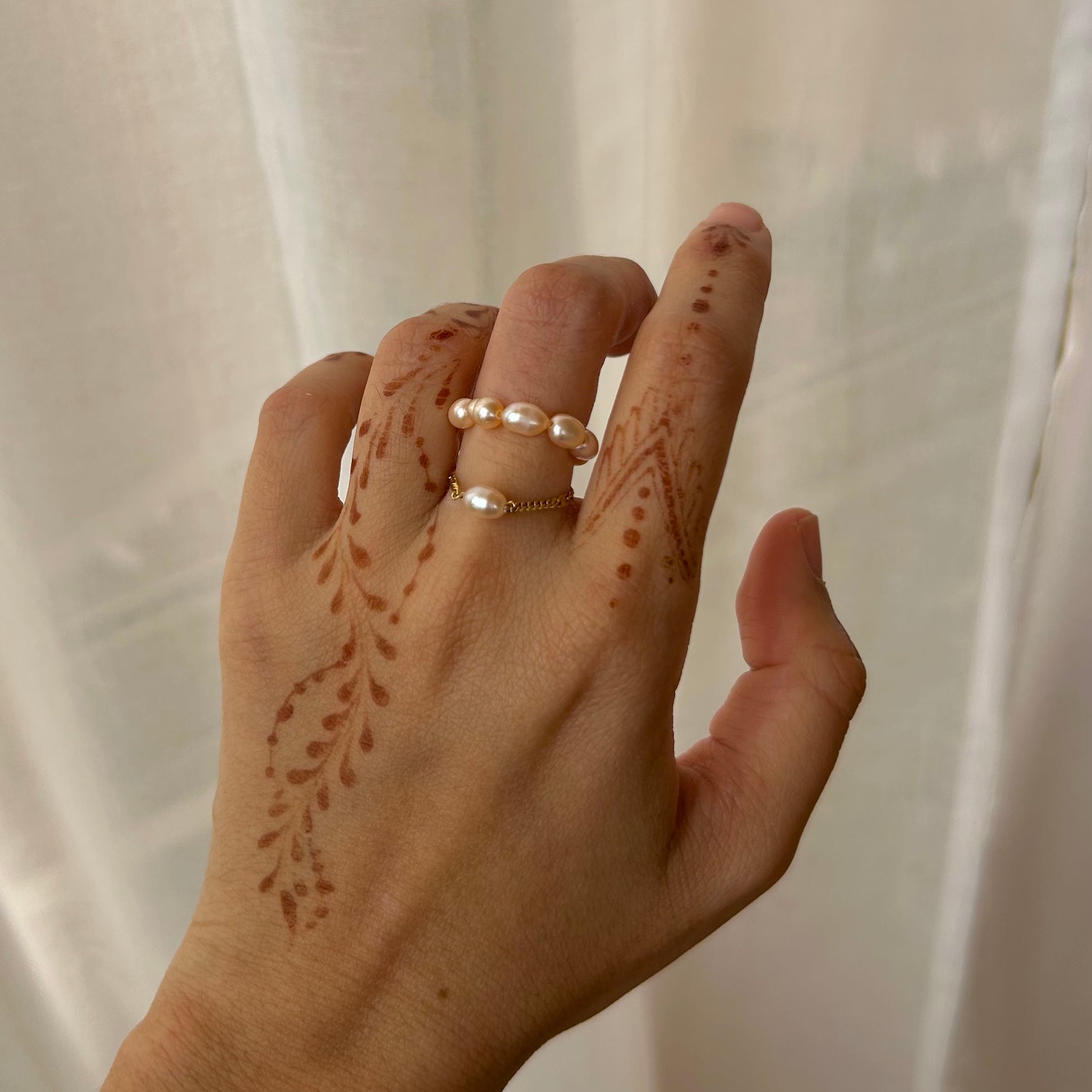 La bague Jadida est confectionnée à la main avec des perles d’eau douce naturelles, offrant une esthétique unique grâce à leur forme irrégulière. Montée sur un fil élastique, cette bague s'adapte confortablement. Il est recommandé de choisir une taille supérieure pour un ajustement optimal.
