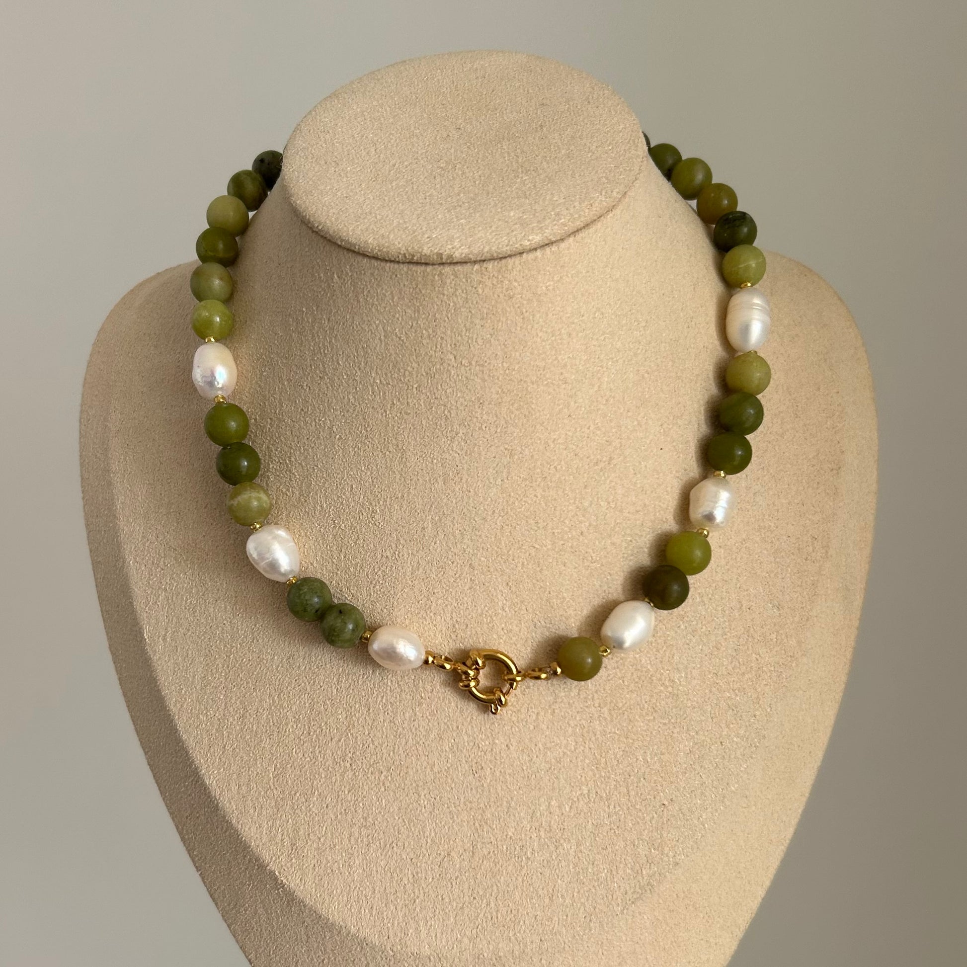Un collier raffiné qui associe la douceur verte de la serpentine à l’élégance naturelle d’une perle d’eau douce.