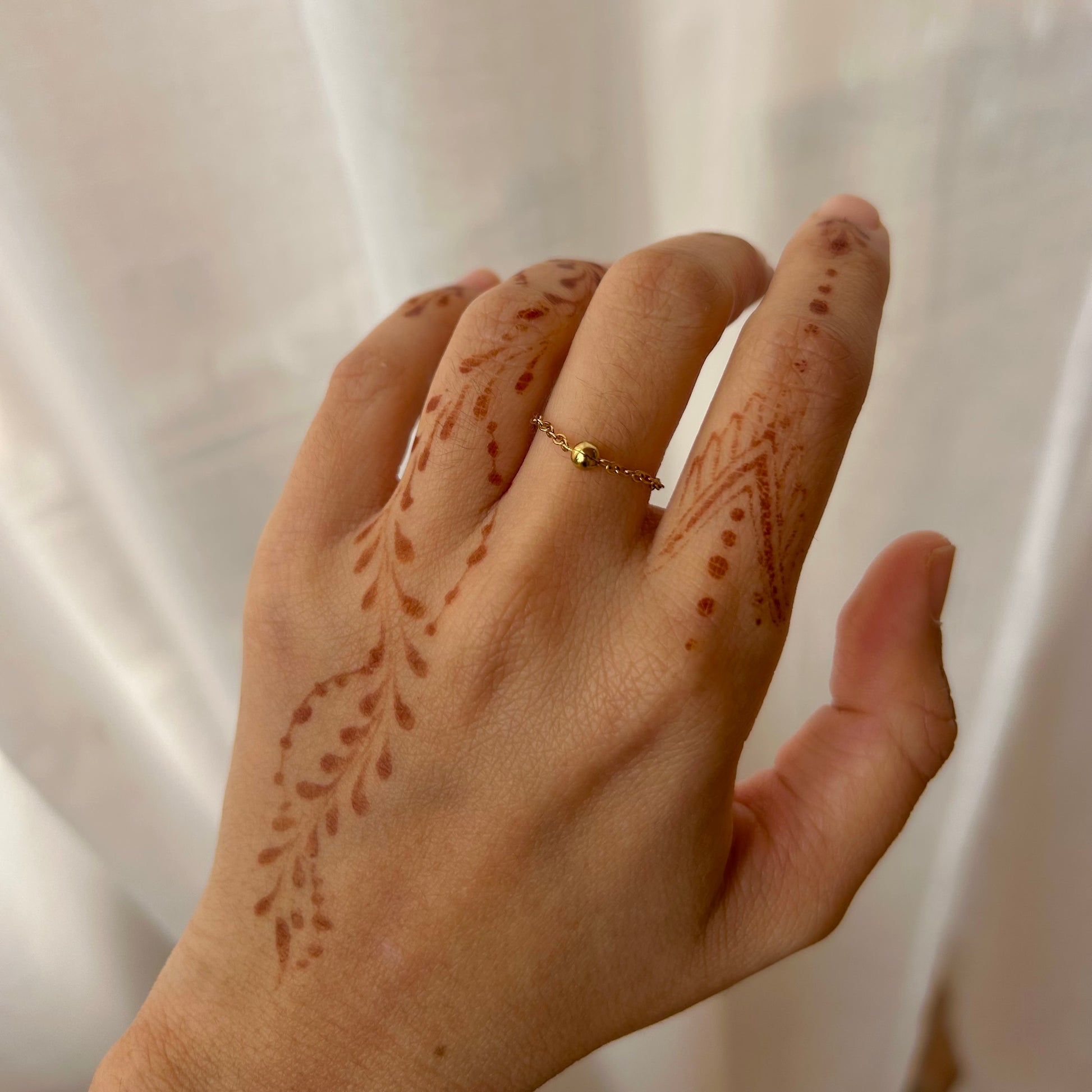 Bague chaîne ornée d’une perle dorée. Veillez à choisir une taille au dessus de votre taille habituelle.